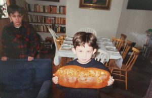 Aaron prepares for a future in baking by making his first loaf of bread aged 5. His older brother Alex watches over him from behind the scenes.